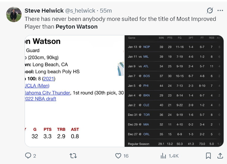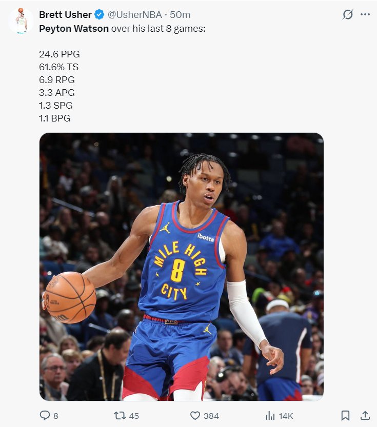 而且上周的西部周最佳球员竟然是沃特森,他生涯首次拿到周最佳,他帮助掘金3胜1负,场均24.5分8篮板4助攻1.3抢断1.8盖帽,命中率50%,不得不说已经攻防一体。